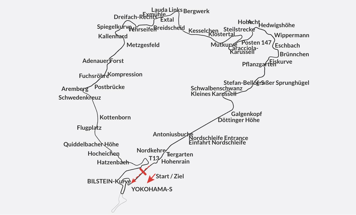 On remonte ensuite sur deux virages à droite, avant une longue remontée (très longue pour les petites catégories). La piste s’ouvre sur le Caracciola-Karussell, un monument du circuit. Il s’agit d’un virage serré, circulaire, avec un fort banking. À l’intérieur, des dalles s’occupent de bien faire rebondir les voitures. À ce stade, vous dépassez la moitié du circuit. Vous et ne tardez pas à arriver à Brunchen, le Youtube Corner, où beaucoup de vidéos sont tournées IRL. Vous reprenez ensuite de la vitesse, en enchaînant les courbes jusqu’à Kleines Karussell. C’est un mini carrousel qui ouvre l’arrivée sur l’interminable ligne droite de retour, jusqu’au circuit F1. Plus de 2 kilomètres à fond, pour soulager les poignées, avant un dernier piège, Hohenrein. Une dernière chicane ou vous ne devrez pas vous endormir, avant de revenir sur le circuit. Félicitations, vous avez fait un tour !