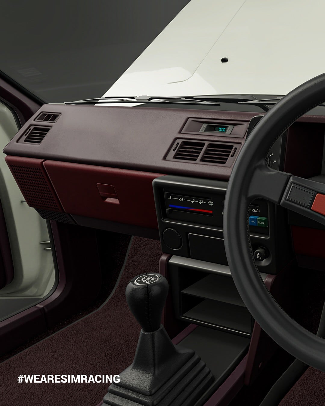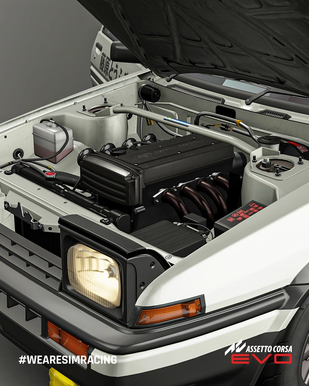 D’après ce qu’on peut voir sur ces images, la Toyota Corolla AE86 qui arrive dans Assetto Corsa EVO correspond à la cinquième génération, produite entre 1983 et 1987. Elle se distingue par une architecture moteur avant et propulsion, là où la majorité de la gamme Corolla était déjà passée à la traction. Aussi, elle repose sur le 4A-GE, un moteur quatre cylindres atmosphérique de 1,6 litre. Ce bloc double arbre à cames en tête et 16 soupapes, doté d’une injection électronique, développait jusqu’à 128 chevaux sur les versions japonaises et européennes à 6 600 tr/min. Certaines déclinaisons pouvaient même grimper jusqu’à 7 800 tr/min, un élément clé de son caractère sportif. Enfin, elle est compacte, légère et relativement abordable.