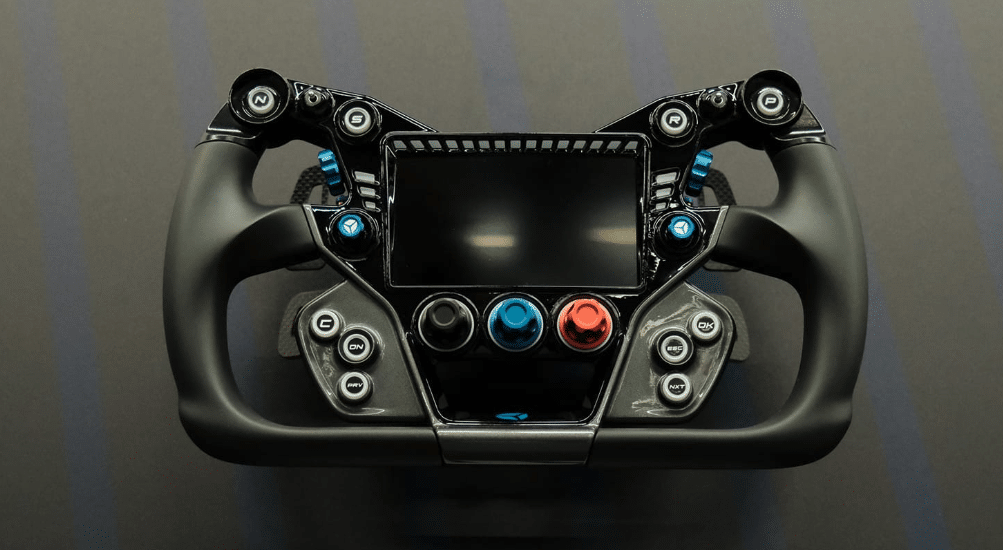Cube Controls est une marque italienne qui propose principalement des roues à la fabrication très soignée. On est clairement sur du matériel à la finition exemplaire. Côté matériaux, on retrouve de l’aluminium, des plaques avant en carbone, des revêtements de qualité… et même des batteries internes. Car oui, ces volants sont proposés en deux versions. Une première avec USB qui se connecte facilement à votre base, une seconde sans fil, pour les utilisateurs de base Simucube. Sur l’ensemble de la gamme, on retrouve des palettes magnétiques sans interrupteur pour le passage des vitesse, mais aussi des boutons rétroéclairés, des sélecteurs, des switchs et autres joysticks multidirectionnels bien finis.