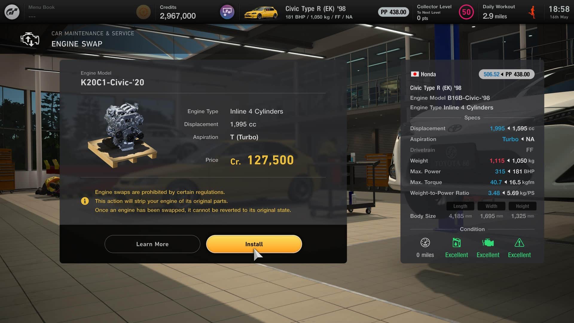 Les préparateurs sont aux anges, l’engine swap est enfin disponible dans le menu GT Auto. Okay mais c’est quoi l’engine swap ?! Rien de compliqué, il s’agit simplement d’échanger le moteur d’une voiture par un moteur d’une autre voiture, souvent plus puissante. Vous rêvez de mettre un V10 de 850 chevaux dans votre Combi Volkswagen ? GT7 l’a fait !