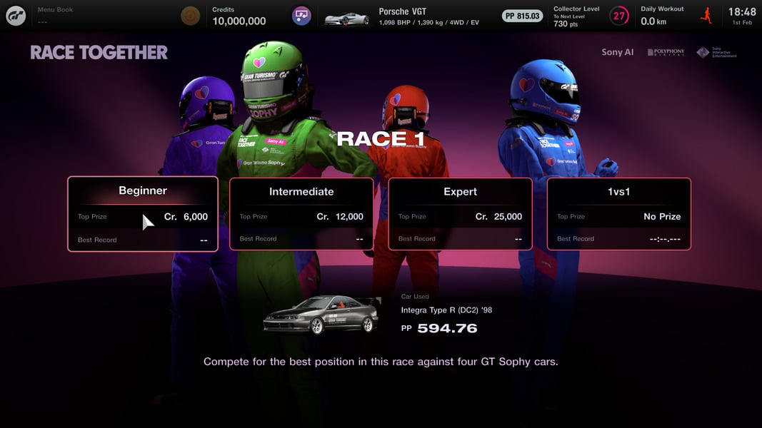 Vous pourrez vous mesurer à Sophy dans le nouveau mode « Courir ensemble » disponible jusqu’à l’arrivée de la prochaine mise à jour fin-mars. Le but étant de confronter l’IA à de vrais joueurs, permettant son perfectionnement pour un retour certain dans les mois à venir. 4 courses sont disponibles dans le mode « Courir ensemble » avec chacune trois modes de difficulté et un mode 1vs1. Vous pourrez accéder à ces nouveaux challenge en haut à droite de la carte du monde une fois le niveau 6 de collectionneur atteint.