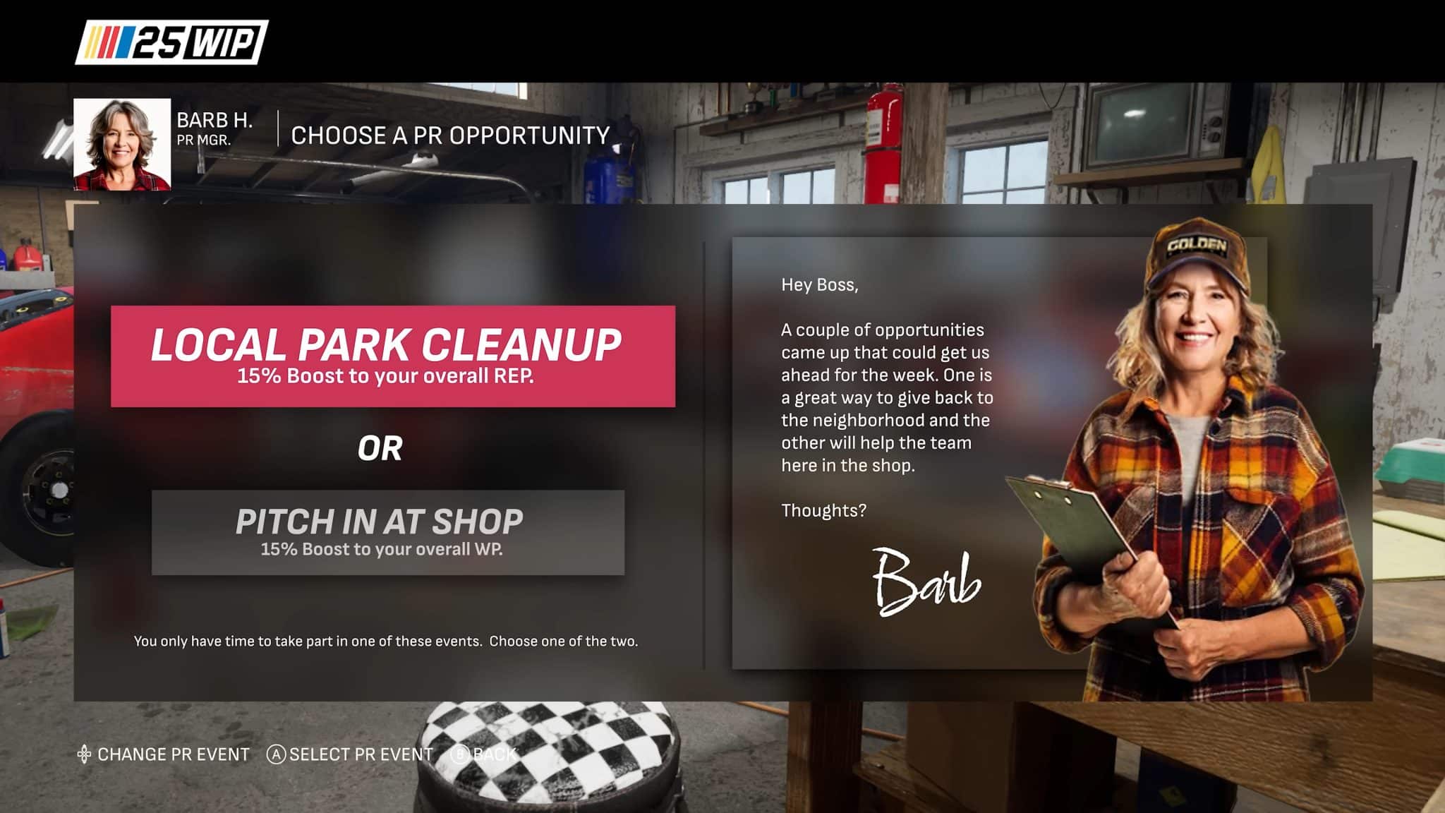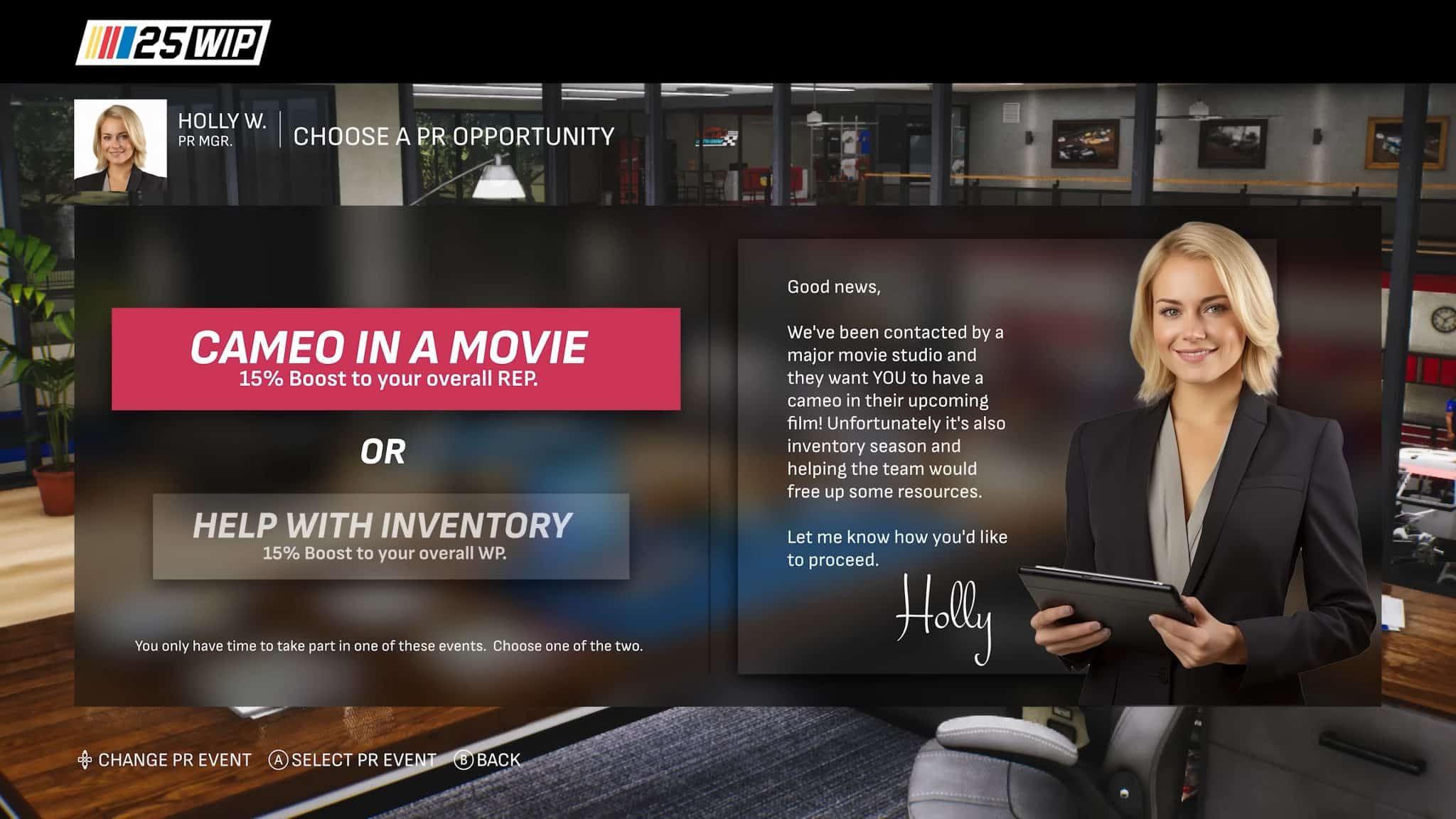 On notera que le mode Carrière de NASCAR 25 ne se limite pas à gagner le plus de courses. En effet, entre les épreuves, les joueurs devront gérer leur garage et leur équipe, et prendre des décisions stratégiques. Ces décisions affectent leur réputation, leur argent, ainsi que leur niveau de recherche et développement. Parfois, on peut choisir entre deux activités afin de booster l’une de ces ressources. Par exemple, participer à un film augmentera notre réputation, tandis que préférer se rendre à une session de développement technique permettre d’améliorer notre voiture. Chaque décision prise influencera notre progression et nos opportunités futures.