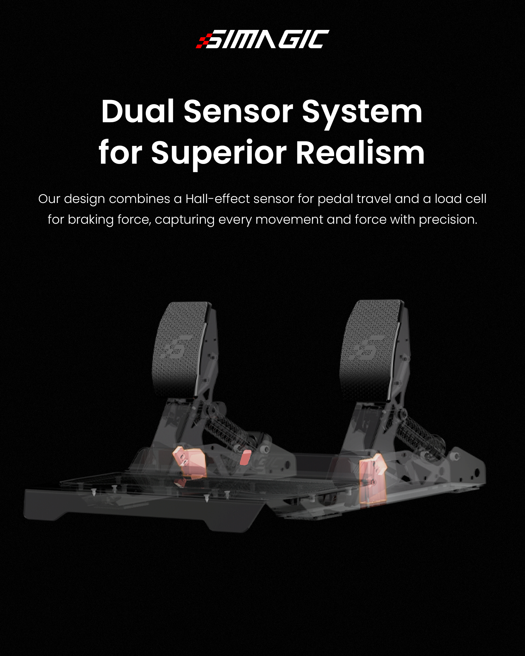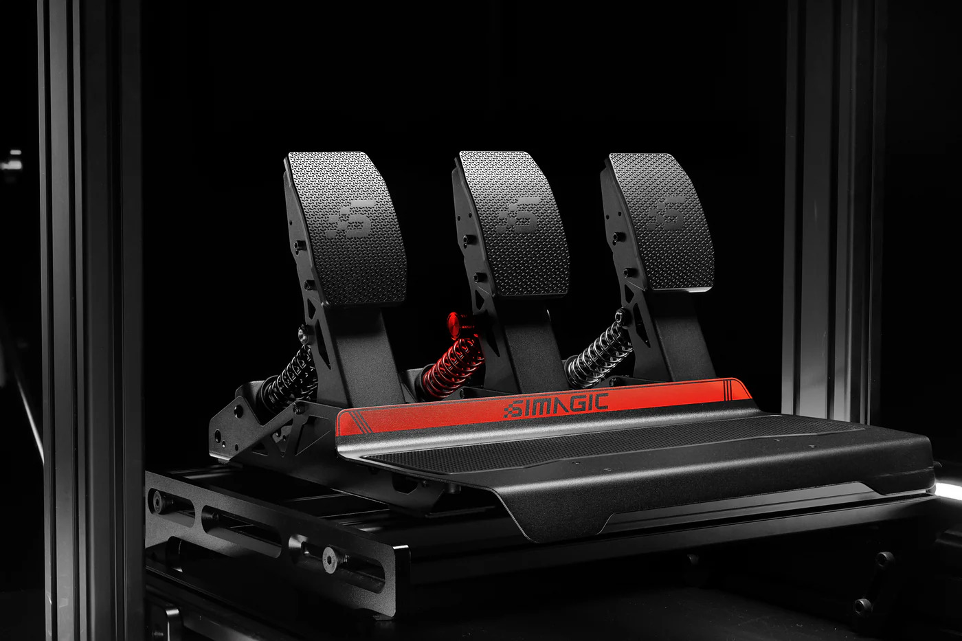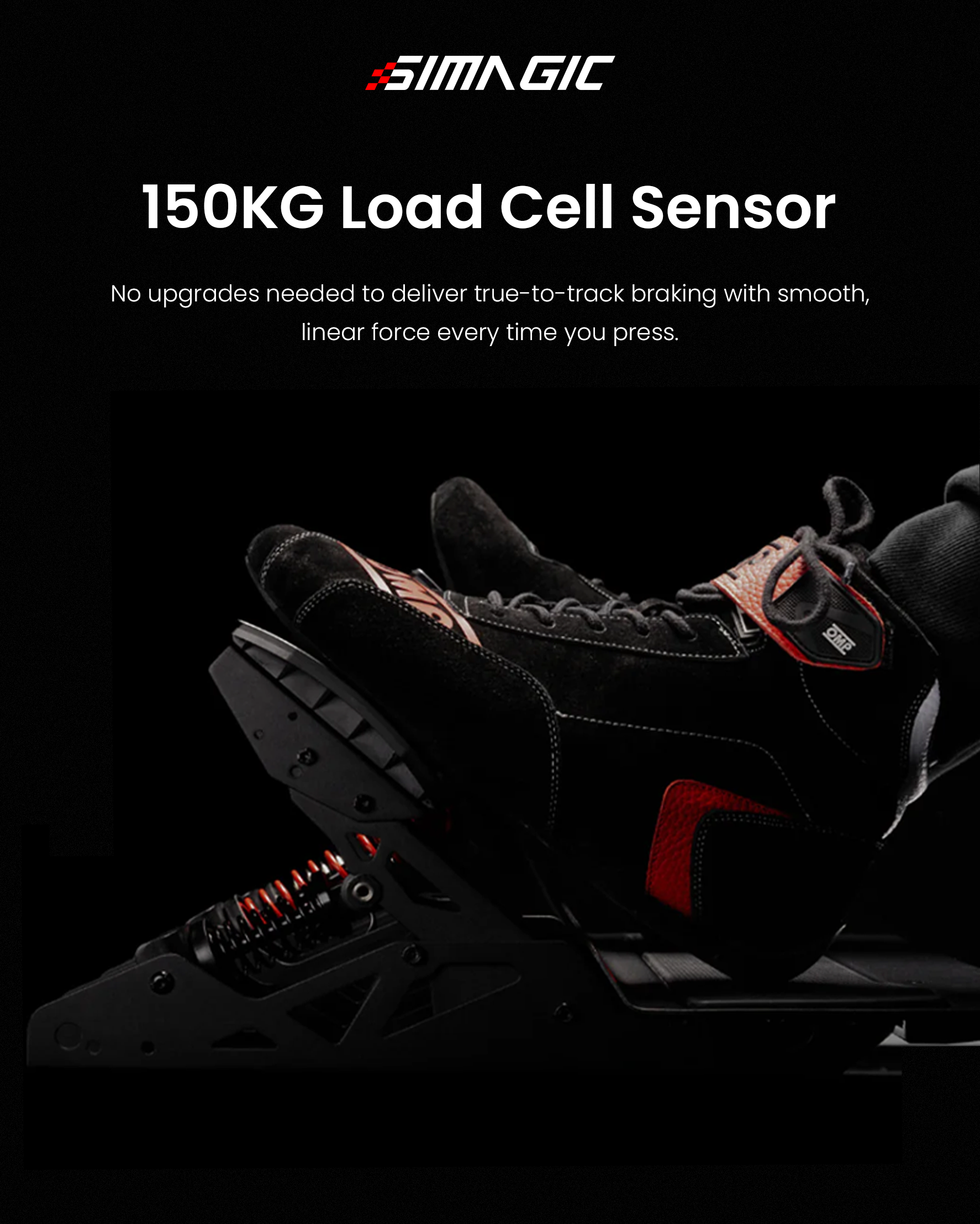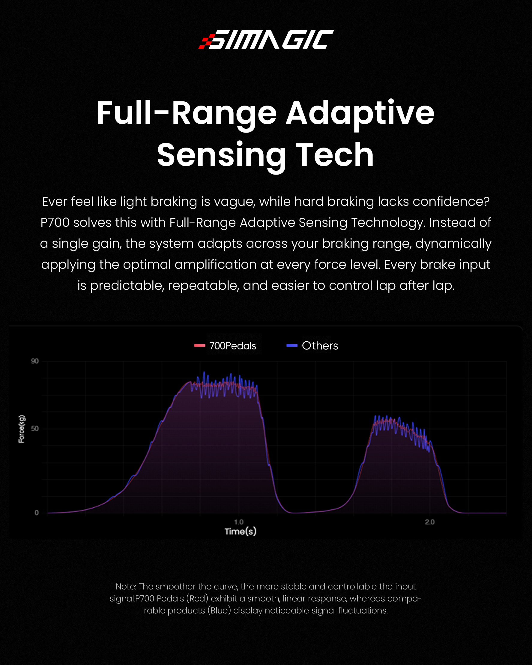 En plus, Simagic veut s’attaquer à un défaut connu sur certains pédaliers : quand on applique une faible pression, la sensation est assez « floue », peu lisible, et quand on applique une pression plus forte, ça manque de finesse ! Pour lutter contre ça, Simagic présente une fonctionnalité intitulée « Full-Range Adaptive Sensing Tech ». Derrière ce nom marketing, l’idée est d’adapter dynamiquement l’amplification du signal de freinage en fonction de la force appliquée. En d’autres termes, le système ajuste automatiquement la réponse sur toute la plage de freinage, afin d’obtenir un signal linéaire, stable et reproductible. Ainsi, sur le papier, ça doit améliorer la constance tour après tour… On verra une fois le pédalier sous nos pieds !