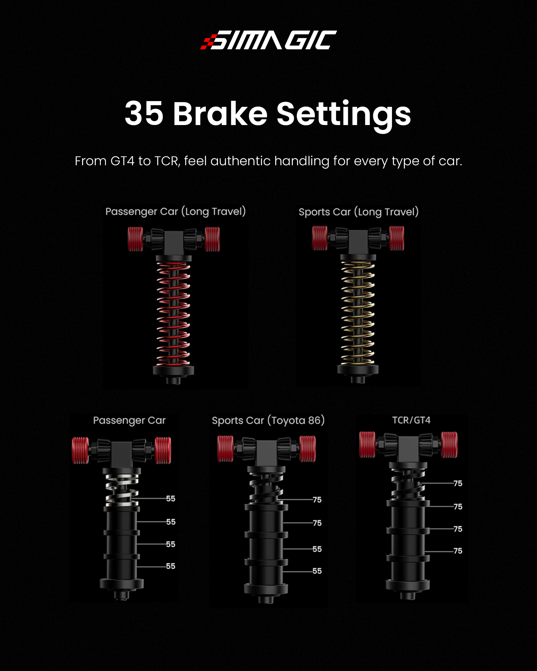 Autre point qu’on avait déjà évoqué en octobre : le P700 propose 35 réglages de freinage, une grande capacité de personnalisation et d’adaptabilité qu’on voit rarement sur un pédalier de cette gamme de prix. En combinant des ressorts et des élastomères interchangeables, on peut obtenir des comportements différents de la plage de notre pédale de frein. Ainsi, on peut simuler différents types de véhicules :