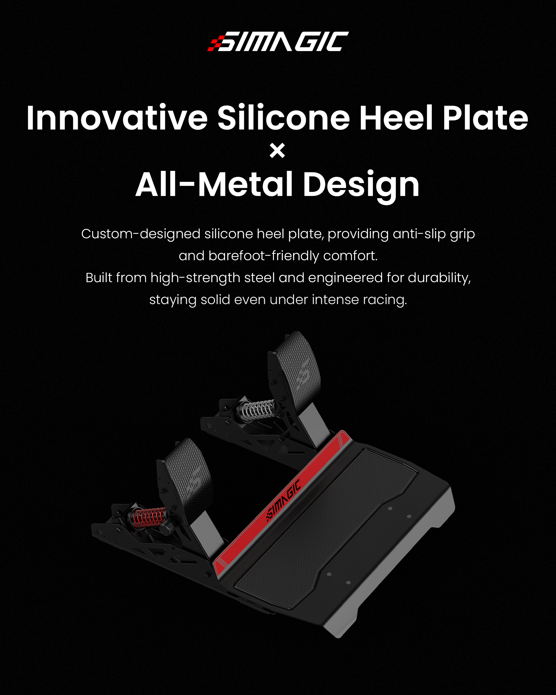 Du côté de ses composants, le Simagic P700 annonce une structure en acier haute résistance capable d’encaisser jusqu’à 200 kg de force. Les pédales sont dans le même matériau. En revanche, la plaque de talon est en silicone antidérapant. Le pédalier pèse 3,6 kg pour des dimensions de 358 × 413 × 218 mm.
