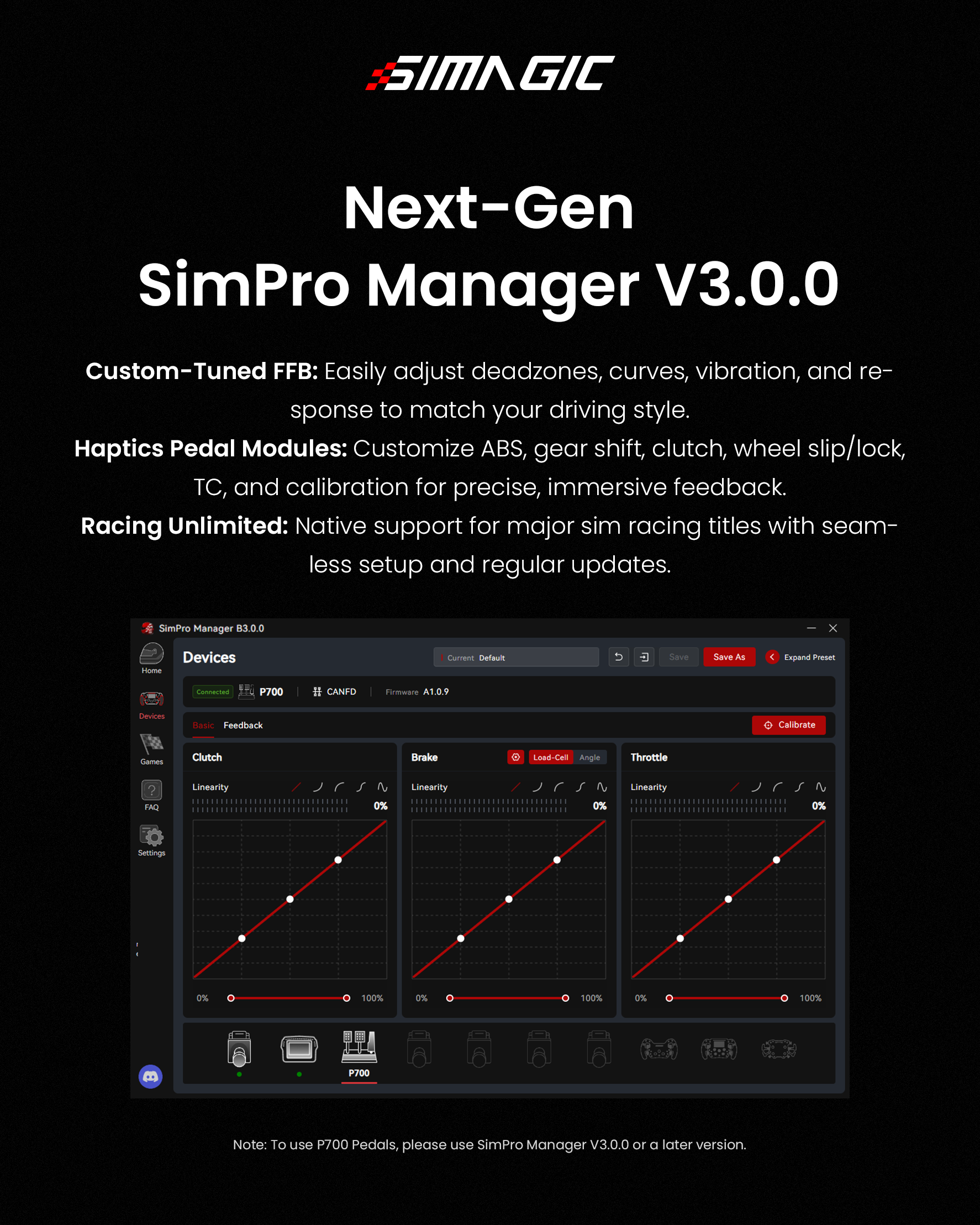 On nous annonce aussi sa compatibilité avec les modules haptiques P-HPR (en option), permettant d’ajouter des effets comme l’ABS, le traction control, la perte d’adhérence, par exemple… Aussi, avec le logiciel SimPro Manager V3.0.0, on peut régler le P700 : ses courbes de réponse, ses zones mortes, l’intensité de ses vibrations, et d’autres effets liés à la télémétrie…