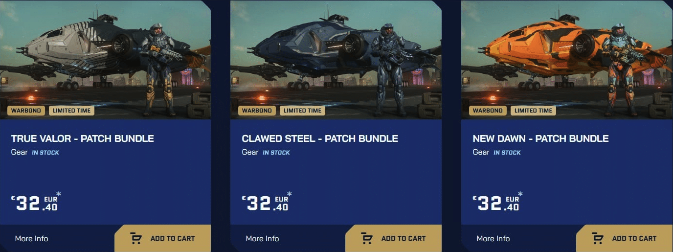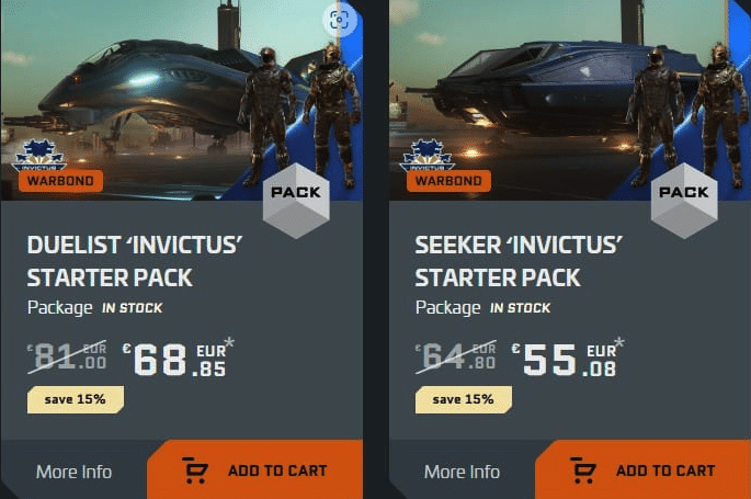 Dès l’entrée, les nouveautés sont mises en avant. Et à la fin de l’Invictus Week, je vous ferai bien sûr un bilan complet. Comme d’habitude, CIG propose un lot de vaisseaux pour démarrer le jeu, avec 15% de remise. Mais ce n’est pas tout : vous obtenez aussi un skin exclusif bleu et or pour votre vaisseau, ainsi que deux armures. Je ne suis pas là pour vous pousser à la dépense, mais soyons honnêtes : s’il y a un moment dans l’année pour investir dans le jeu, c’est pendant l’Invictus.