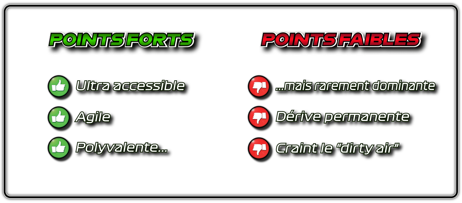 Pour finir, notez qu’elle craint le « dirty air », les turbulences aérodynamique des adversaires proches. Comme toute voiture de course, me direz vous. Certes, sauf que dans le cas présent, l’effet de dérive va augmenter et il devient compliqué de négocier les entrées de virages. Gardez en tête que lorsque vous suivrez quelqu’un de près, il faudra soigner l’entrée de virage en anticipant la dérive supplémentaire causée par le dirty air.