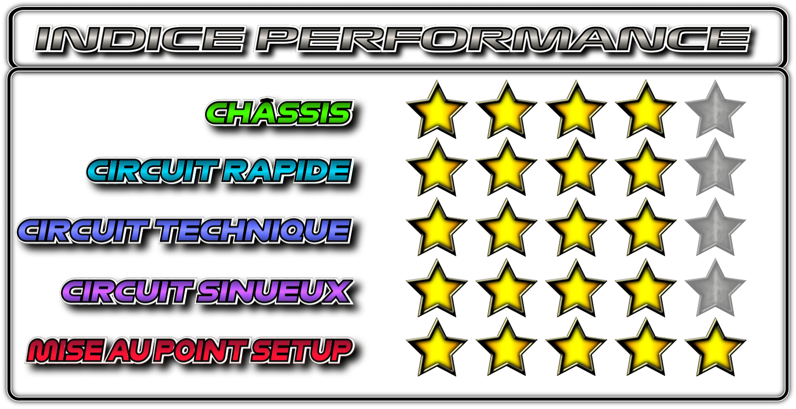 En faisant la moyenne des précédentes notes on obtient un Indice de Performance de 4,2/5 !