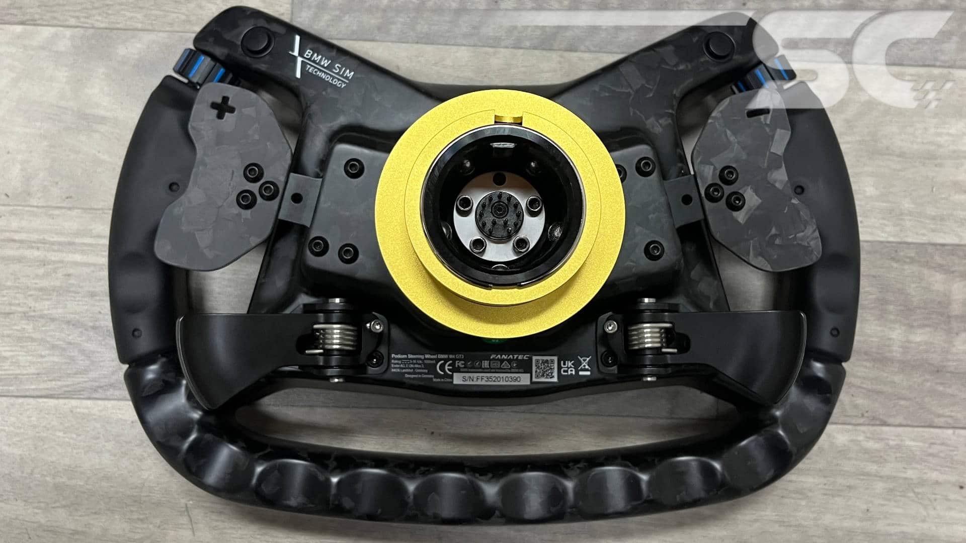 Nous avons donc entre les mains un volant de type GT moderne de 31 centimètres de large, avec une construction en carbone. Il est équipé de palettes à clic pour le passage des vitesses et des palettes progressives pour l’embrayage et l’accélérateur. 14 boutons, une croix directionnelle, un écran pour la gestion du volant et un quick release de type QR1 dans la boite. Mais surprise, les acheteurs du Podium Steering Wheel BMW M4 GT3 recevront le nouveau QR2 dès sa sortie, qu’on estime pour la rentrée 2023.