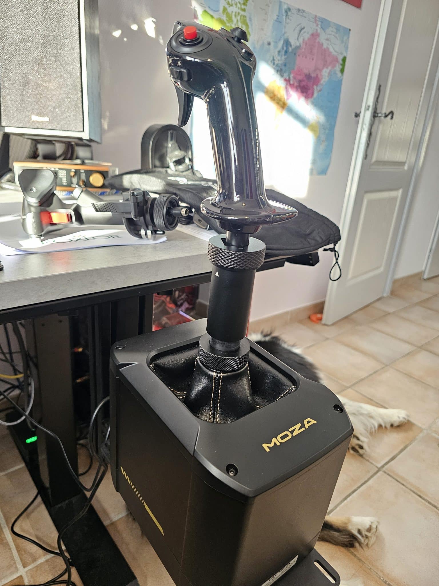 Je n’ai pas pris de photo du Flight Clamp, et j’ai préféré vous montrer ma configuration avec mes supports Monstertech, qui permettent de fixer la base plus bas que le support Moza. Ainsi, ma main se trouve à 7 cm au-dessus du bureau. Ce n’est pas parfait, mais c’est suffisamment jouable. Cependant, après de longues sessions de vol, le bras finit par fatiguer. On aura donc tendance à privilégier le pilotage automatique et à n’utiliser le joystick que pour les phases critiques : décollages, approches et ajustements en vol.