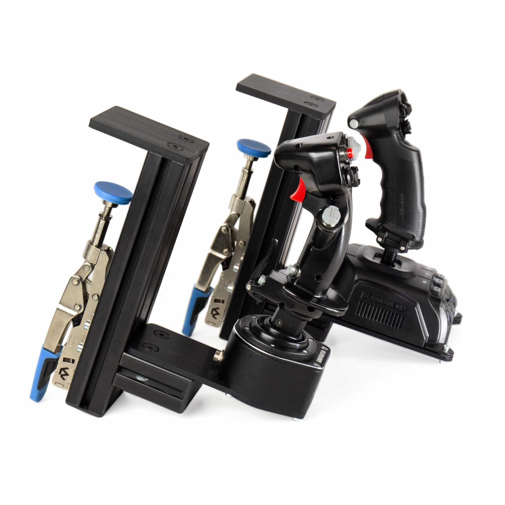 La conception du support de bureau pour joystick HOTAS repose sur une stabilité absolue. Le support doit être fermement fixé à la table et ne doit pas vaciller, même sous une forte pression. Le joystick ou la manette des gaz doit pouvoir être retiré rapidement afin de ne pas modifier l’utilisation du bureau en cas de besoin. Les plaques de montage ont été adaptées individuellement à la forme et aux exigences de chaque joystick ou manette des gaz. Elles sont disponibles séparément et peuvent être commandées à nouveau si nécessaire. La hauteur des plaques de montage pour le joystick ou la manette des gaz peut être ajustée et fixée en continu. La sauterelle de serrage d’origine Bessey (un des leaders mondiaux des systèmes de serrage) garantit une fixation sûre et fiable.