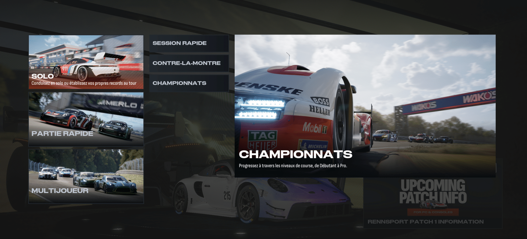 Pour la partie solo, on assiste enfin à l’arrivée de l’onglet « Championnat » qui permet de faire des courses contre l’IA. Cette fonctionnalité était très attendue par le public. On y reviendra un peu plus tard, car elle mérite qu’on s’y attarde. Pour le reste, les pages du menu restent similaires à la version Early Access. On retrouve maintenant 5 pages :