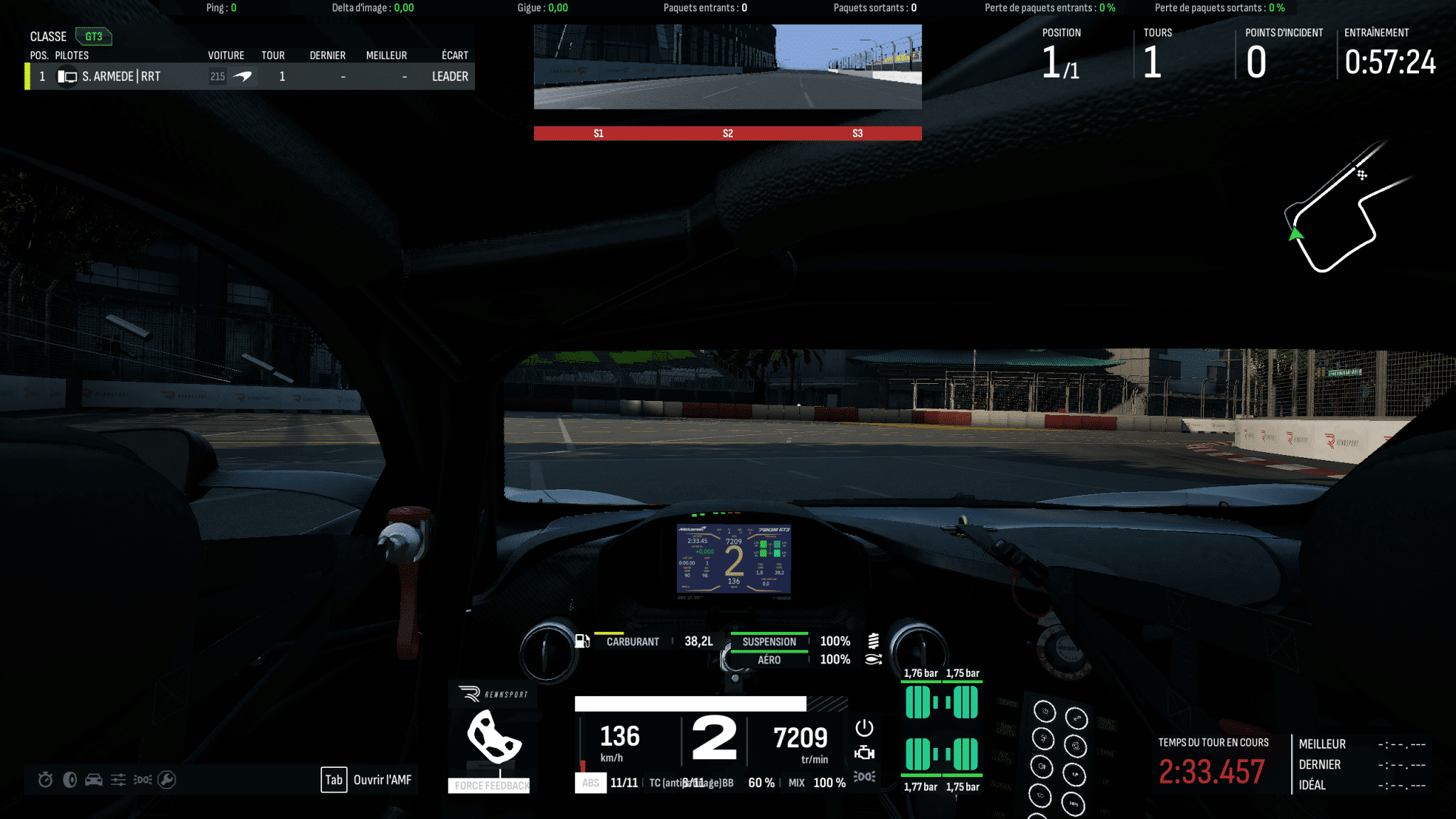 Globalement, la physique respecte les spécificités de chaque classe de voitures et offre une vraie variété dans l’expérience de conduite. On apprécie la possibilité d’ajuster le FFB par véhicule directement en piste, permettant d’adapter la force à ses préférences. Côté pilotage, n’hésitez pas à réduire le contrôle de traction (lorsqu’il est disponible) pour extraire de meilleures performances, et à le désactiver complètement (TC 0) pour les départs en grille.