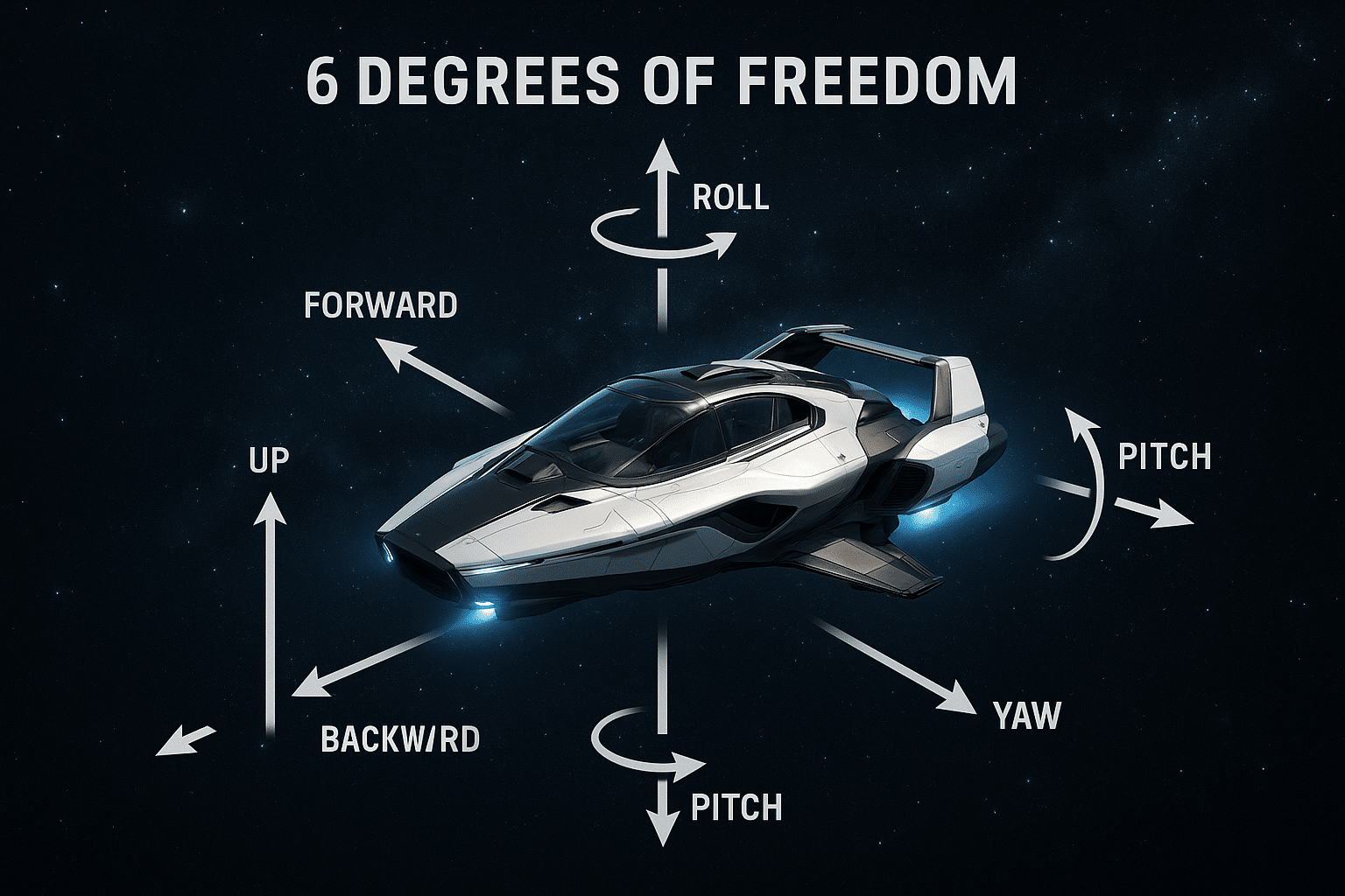 Pour commencer, on parle souvent de six axes de mouvement. Ces six axes permettent à un vaisseau de se déplacer dans toutes les directions possibles, et de tourner sur lui-même, un peu comme si on avait une liberté totale dans un espace sans frontière. Ces mouvements se divisent en deux catégories : la translation et la rotation.