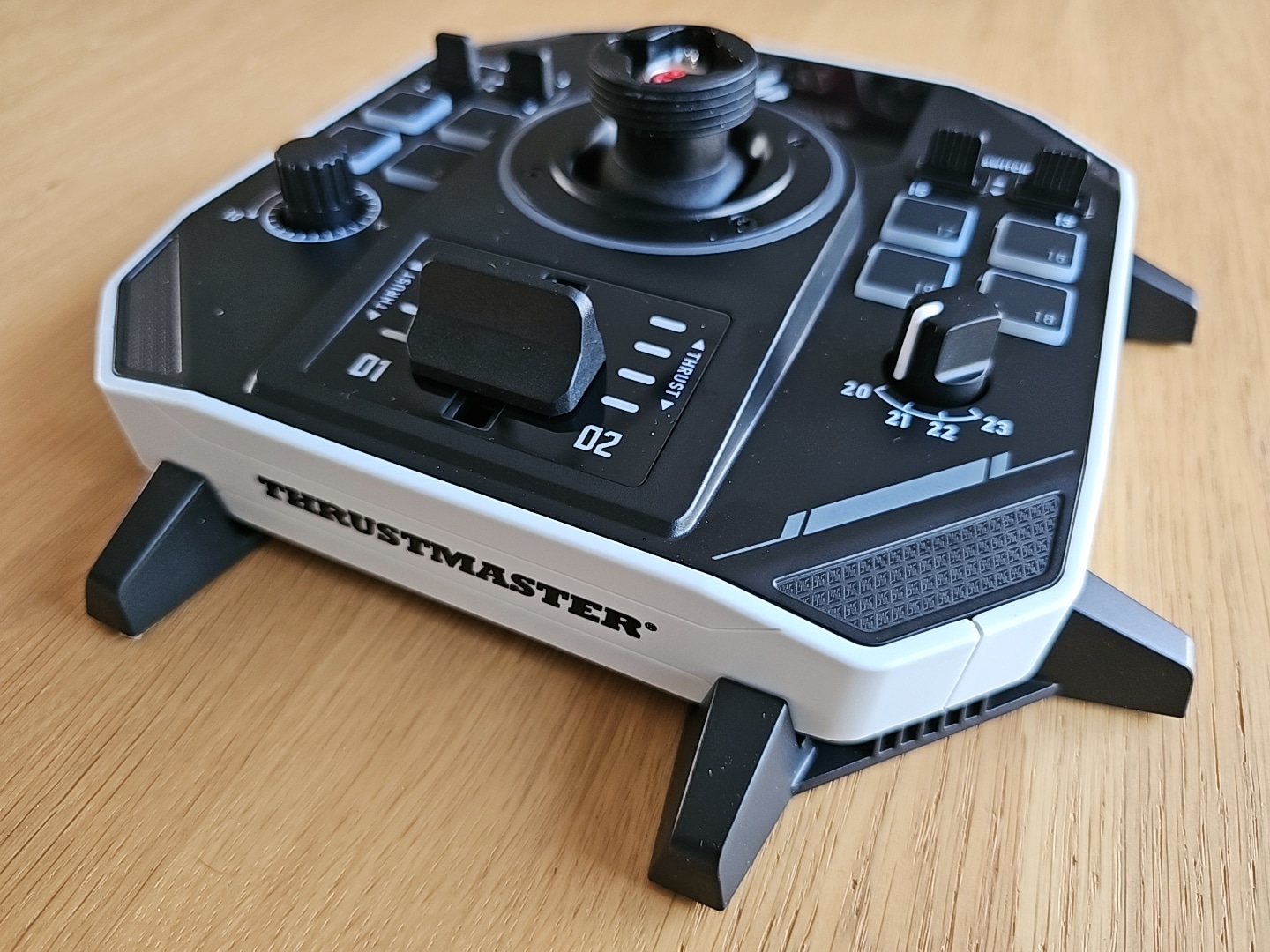 Avec un peu moins d’un kilo sur la balance, la base se montre lourde et bien stable. Elle affiche des dimensions de 196 x 196 x 70 mm avec les supports de stabilité installés. Même sans ces supports, la stabilité reste tout à fait satisfaisante. Thrustmaster a toutefois choisi d’ajouter ces extensions pour améliorer la tenue en situation de dogfight, où des torsions rapides et puissantes sur l’axe Z peuvent faire légèrement bouger la base. Avec les supports en place, il faut vraiment appliquer une force conséquente pour provoquer le moindre déplacement.
