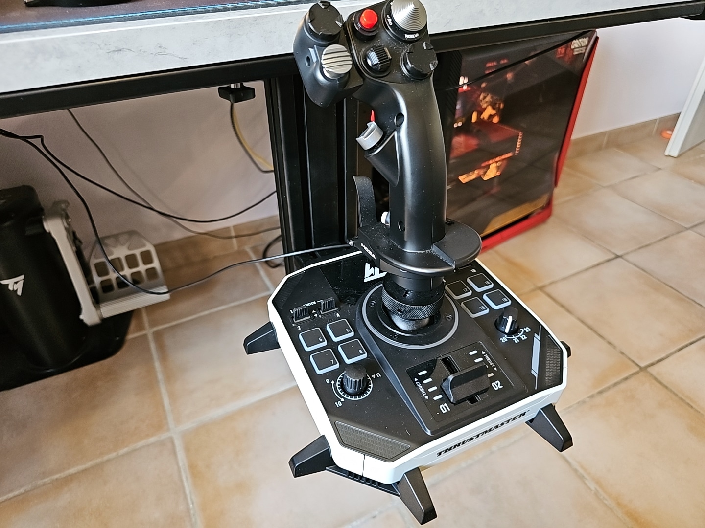 Par habitude, j’ai positionné mon GameGlass au centre, mais avec la profusion de commandes et le keybinding optimisé proposé par Thrustmaster, on pourrait facilement s’en passer. Cela dit, visuellement, cette configuration apporte une touche moderne au setup. Grâce aux deux axes Z, le palonnier devient presque superflu, se contentant de faire office de cale-pied. Côté ergonomie, on n’est pas dans une configuration idéale, mais on reste dans de bonnes conditions d’utilisation — et c’est dans ce cadre que j’ai décidé de faire mes tests.
