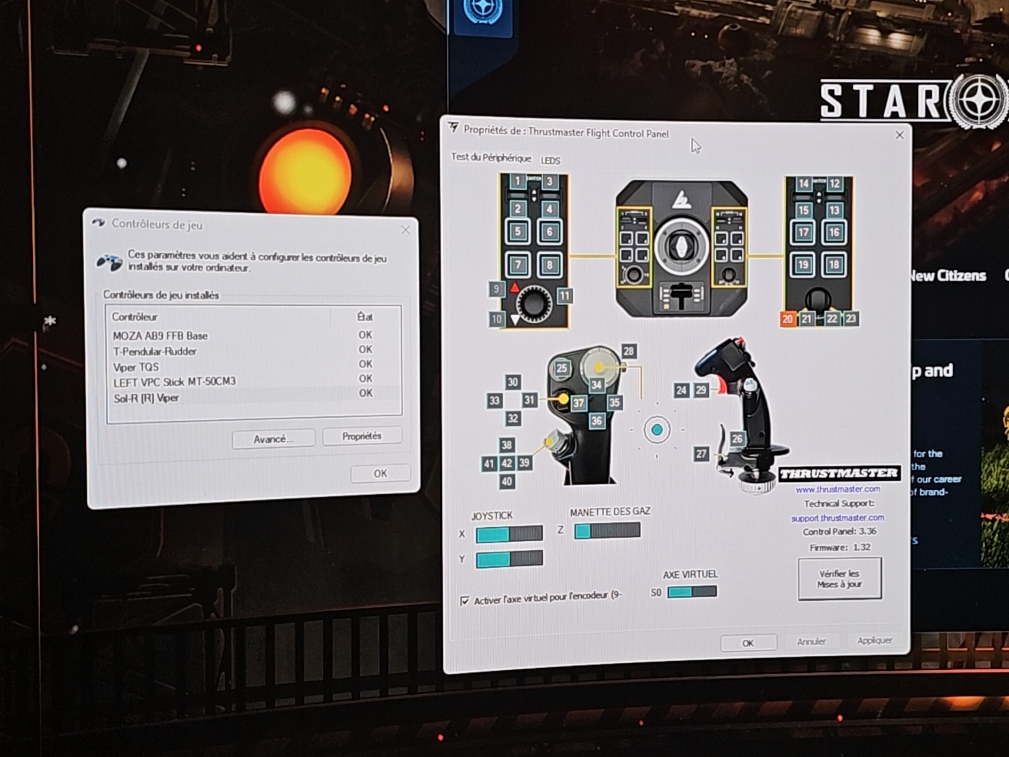 Je vais probablement me faire taper sur les doigts par Thrustmaster, mais soyons honnêtes : si vous connectez un grip Virpil Constellation Alpha Prime, ou encore un grip Moza comme le MH16 ou le MA3X sur la base SOL-R, est-ce que ça fonctionne ? La réponse est simple. Avec les Moza MH16 et MA3X, la base SOL-R les détecte comme des joysticks Viper. Résultat : tout fonctionne, avec une attribution des numéros de touches propre à ces grips, mais avec l’affichage visuel du SOL-R dans le logiciel. C’est normal.
