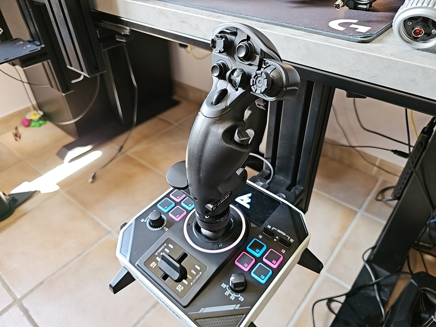 Retour dans un monde connu avec le montage sur mes supports de bureau de chez Monstertech. C’est un retour en grâce. Le joystick est positionné 15 cm en dessous du bureau. La base repose sur le support, à l’emplacement de mon ancien Thrustmaster TCA Airbus Edition. Les trous de la plaque correspondent au support du TM16000M.