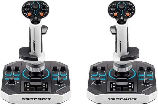 Thrustmaster propose plusieurs configurations adaptées aux jeux spatiaux, selon que vous jouiez en HOTAS (manette des gaz + joystick) ou HOSAS (deux joysticks). On va résumer ici les périphériques les plus pertinents mais si vous souhaitez en savoir plus, un article complet vous attend en lien ci-dessous 👇🏻